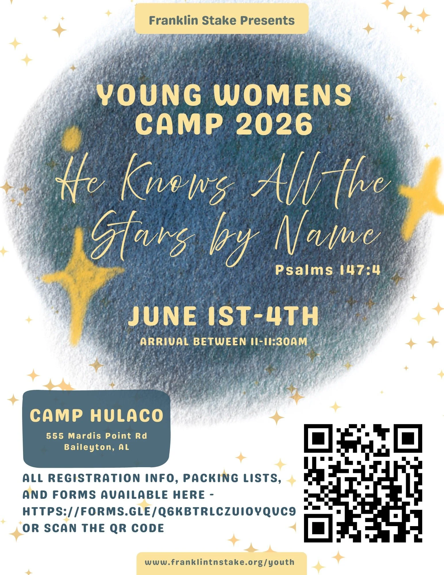 Please note that, based on the rotation at Hulaco, we will also have YW camp June 1-4 and YM camp June 4-6.